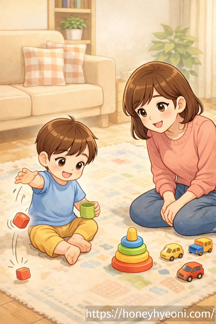두 번째는 놀이를 확장하는 것입니다. 예를 들어 물건을 계속 떨어뜨린다면 “이번에는 상자 안에 넣어볼까?”, “이건 더 높은 곳에서 떨어뜨리면 어떻게 될까?”처럼 변화를 주는 방식입니다. 이렇게 하면 아이는 같은 행동을 기반으로 새로운 경험을 하게 되고, 자연스럽게 반복에서 벗어나게 됩니다.